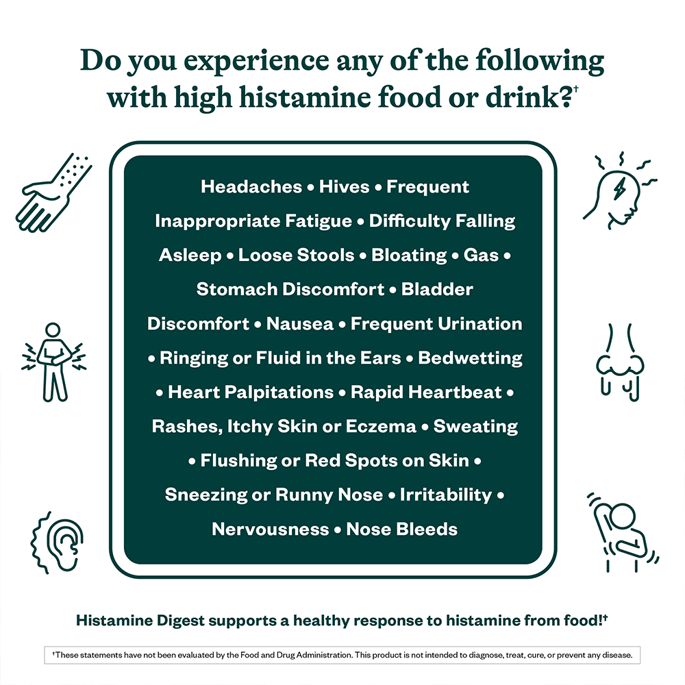 This is a great idea to try: Take 1 capsule of Histamine Digest™ on an empty stomach to see if you feel better within 30 minutes.